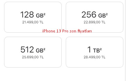 Kur fiyatları düştükten sonra iPhone 13 Pro 128 GB dahili depolama hafızası olan modeli 21.499 TL‘ye düştü. 256 GB olanı 22.899 TL, 512 GB olanı 25.699 TL ve 1 TB olan modeli 28.499 TL olarak güncellendi.